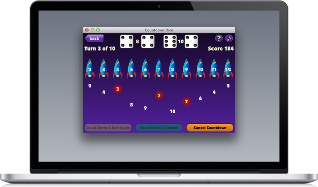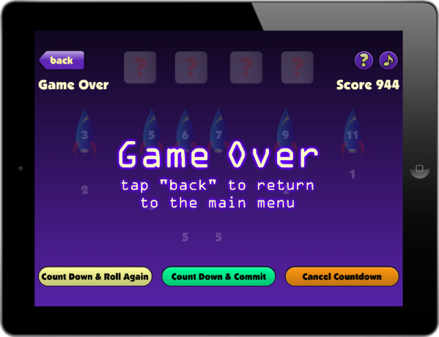 Roll as many times as you like, but be careful that you don't get yourself stuck! Roll the dice and swap pairs to count down rockets and gain points. But your scores do not count until you commit them. Roll as much as you want, but you must be able to count down a rocket. If you cannot count down a rocket, then you must cancel your turn and lose your progress.