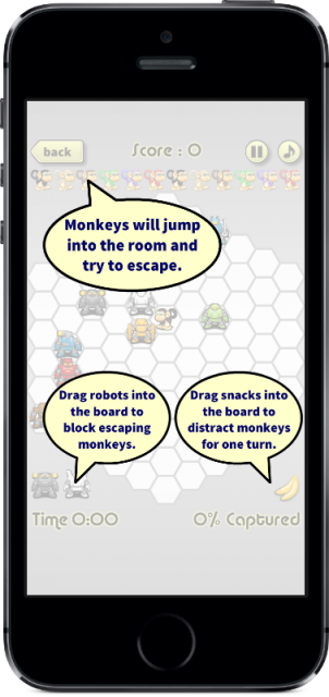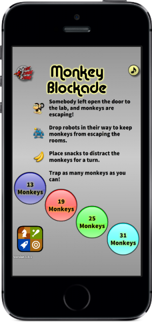 Monkey Blockade is a very quick-playing strategy puzzle game. Monkeys have escaped in your lab, and you need to keep them from escaping. You have a fleet of robots that will stand in their way, but the monkeys always seem to find the quickest way around. You need to plan ahead to keep your monkeys away from the edge.