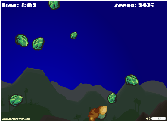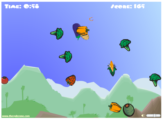 You are an olive with a gun, the latest in a long and proud line of heavily armed condiments, and the planet Salad Bar is under attack from evil flying vegetables. Using the arrow keys and spacebar, shoot down the vegetables. Look out for falling vegetables, as they'll cost you points if you are hit.