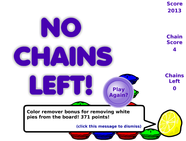 It's simple addictive fun. Explode chains of like-colored pies for points. The bigger the chain of pies you explode, the more points you get. Release gifts for points or bonuses.