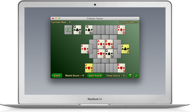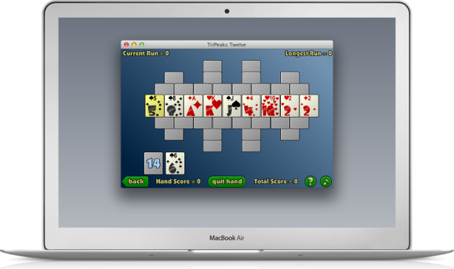 TriPeaks has been a popular computer solitaire game for twenty years, and TriPeaks Twelve is the best TriPeaks value you\'ll find. In addition to the classic three-peak game, TriPeaks Twelve has several other fun versions, ranging from really easy to nigh-impossible. The tougher levels introduce "Jokers Wild" modes so you don\'t get too frustrated. TriPeaks Twelve offers four different card styles and internet-shared high scores so you can brag about your accomplishments to the world. If you are looking for classic TriPeaks, or if you want to try something new, TriPeaks Twelve is just the thing!